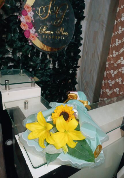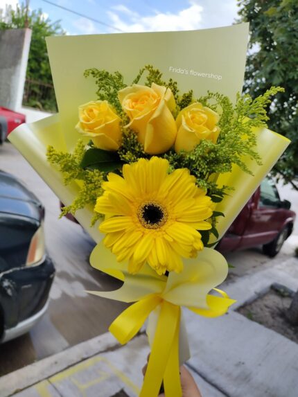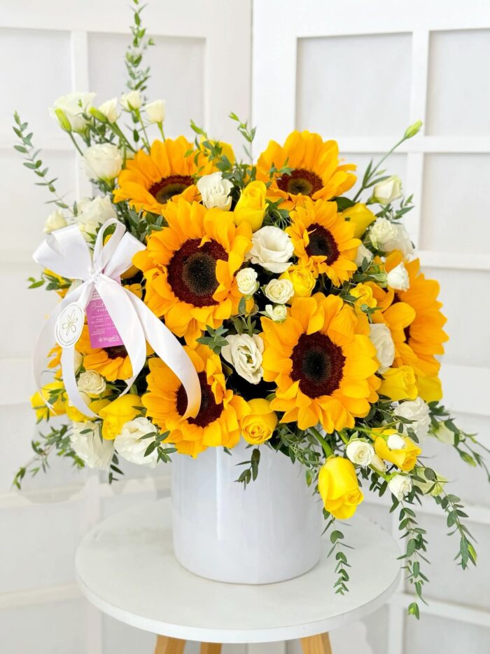 BOX BLANCO CON DE 12 GIRASOLES Y UNA DOCENA DE ROSAS AMARILLAS