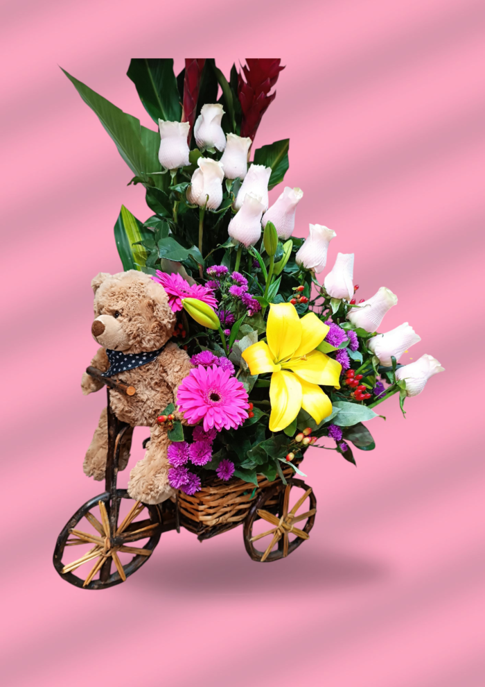 DE ROSAS IMPORTADAS , LILIUMS Y UN PELUCHE . MAS FINO FOLLAJE.